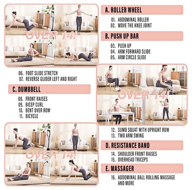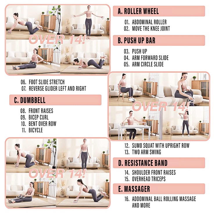 Multifunctional combination function, you can combine 16 differences fitness method according to your needs, such as the abdominal wheel, push-up support, dumbbell, steel ball massager, and so on.